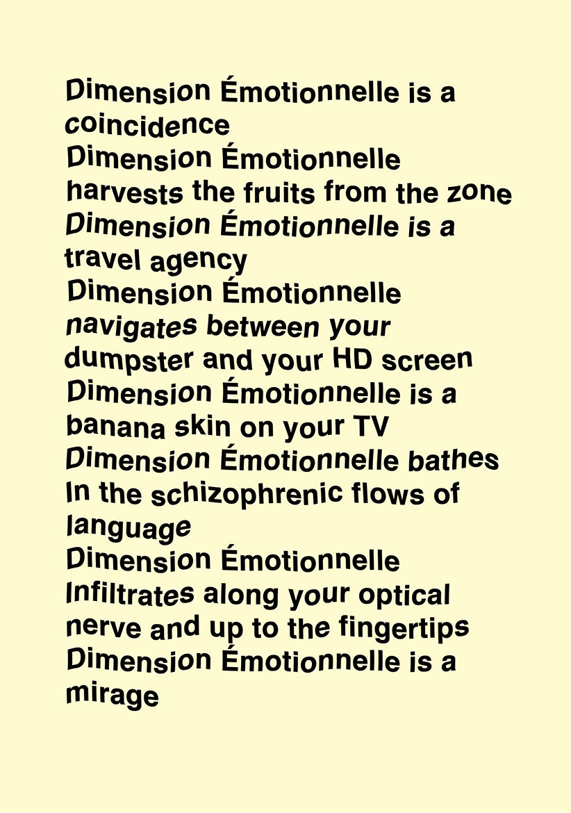 Dimension Émotionnelle is an entity run by a group of 3 artists working together since 2012. The main medium is video and installation with a special place for writing and experimental narrative forms. The works are generally based on « field surveys » : Prospecting in particular areas, meetings of individualities and exploring different areas of knowledge, in order to question concepts of object, fetishism, communication, language, images and myths promoted by advertisings and new technologies.
