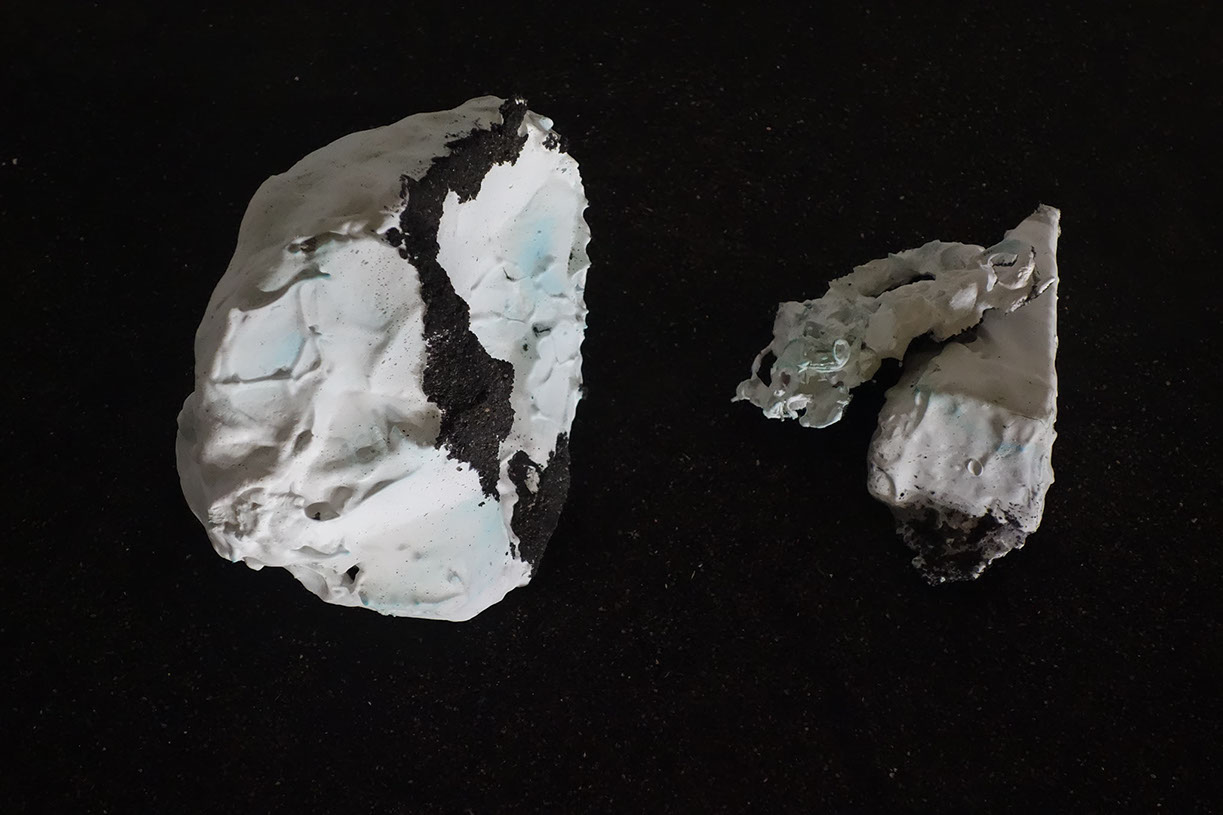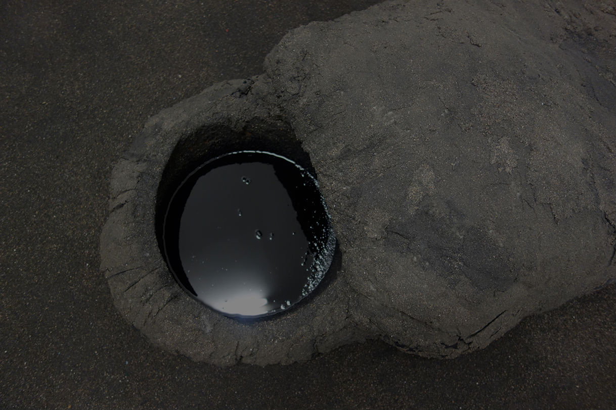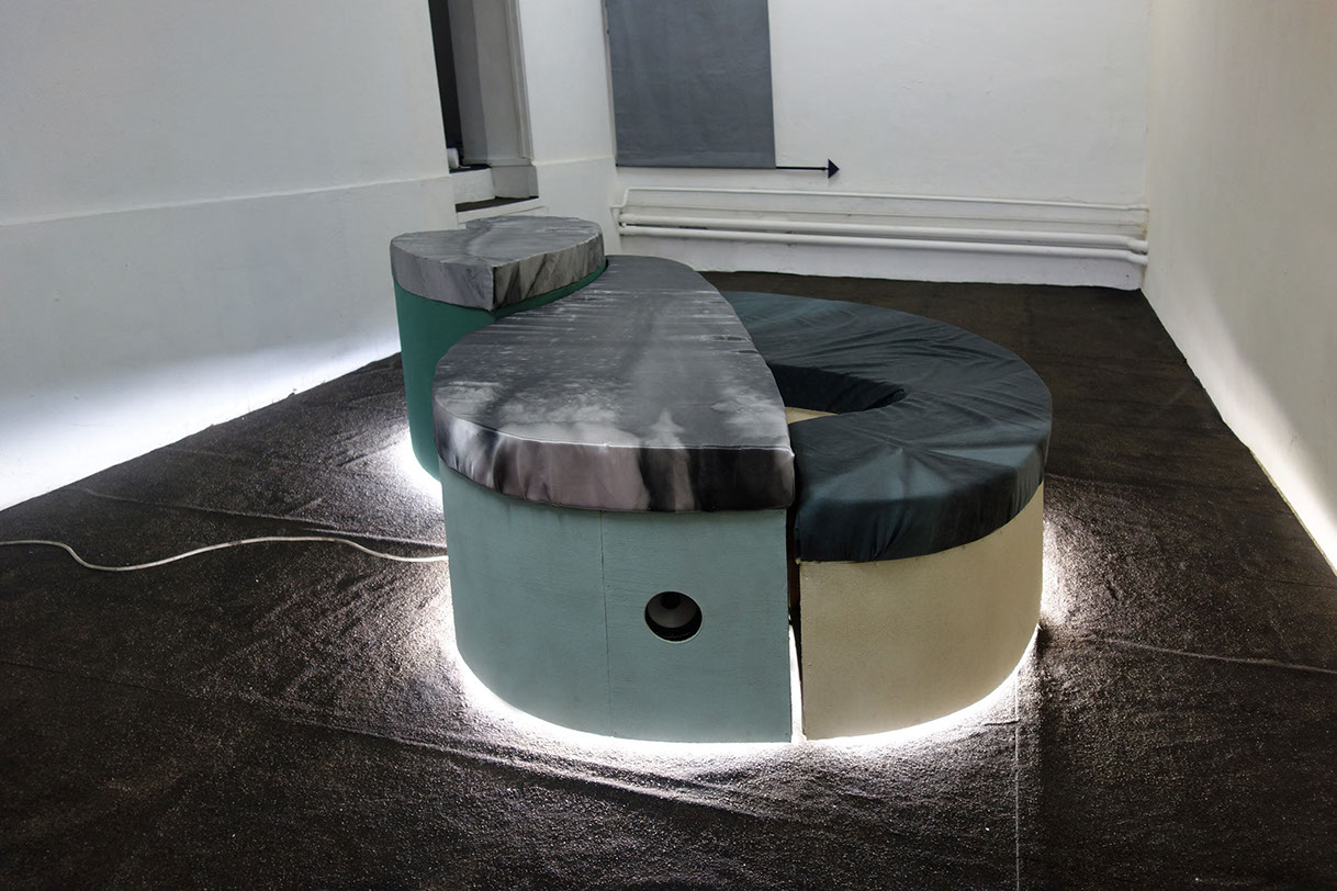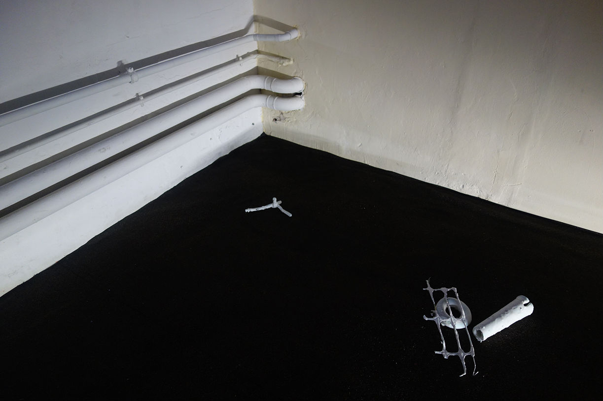 (broadcast of the sound piece Phantom of Speech, video projection, sand, tar, engine oil, leds, foam, fabric and various materials)
