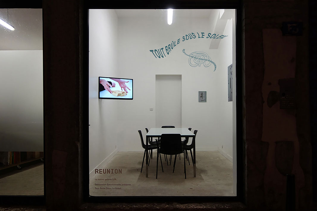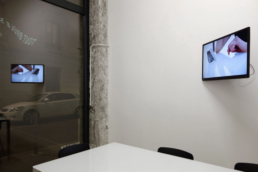 Cheminant avec le temps, la lumière traverse les zones et use les matières. « Tout brûle sous le soleil » est un rayon du passé qui rejoue et abîme la scène de l’usure. Dans une salle de réunion achronique et aseptisée, on a convoqué les restes d’une investigation urbaine pour les faire parler. Exposés sur une table réfléchissante, ces objets brûlés témoignent d’un passage sous les feux, naturels ou artificiels. Mais c’est par le truchement de la vidéo qu’éclate le prisme de la lumière : ils étaient reflétés et objets de réflexion, ils deviennent les produits d’une lumière dédoublée, fossiles diffusés sur écran LED dans une vidéo aux allures de publicité, croisée aux recherches philosophiques. Désormais, d’où vient la lumière ? De quel temps, de quelle dimension rapporte-t-elle ces objets ? Et où sont passés ces commerciaux en cravate ?